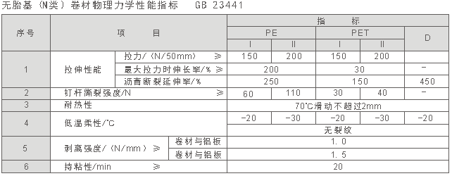 A 產(chǎn)品按有無(wú)胎基增強(qiáng)分為無(wú)胎基(N類(lèi))、聚酯胎基(PY類(lèi))。