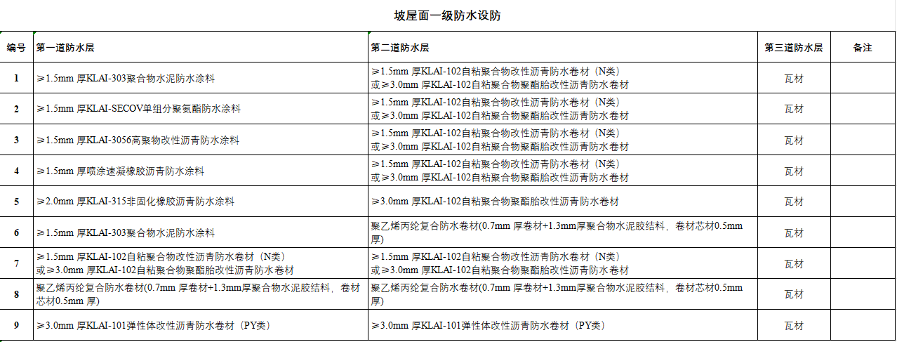 說(shuō)明:1 防水涂料或防水卷材厚度指單道防水層最小厚度;2 當(dāng)采用溶劑型聚氨酯防水涂料與瀝青防水卷材相鄰設(shè)防時(shí),宜設(shè)置 20mm 厚 M15 的水泥砂漿隔離層,其他設(shè)計(jì)方案同;3 耐根穿刺防水卷材的施工方法應(yīng)與耐根穿刺檢測(cè)報(bào)告中注明的施工方法一致;4 粘結(jié)材料與防水卷材共同形成復(fù)合防水層時(shí),應(yīng)單獨(dú)對(duì)粘結(jié)材料進(jìn)行檢測(cè),確保合格;5 當(dāng)聚乙烯丙綸復(fù)合防水卷材、聚乙烯丙綸耐根穿刺復(fù)合防水卷材采用水泥基材料
