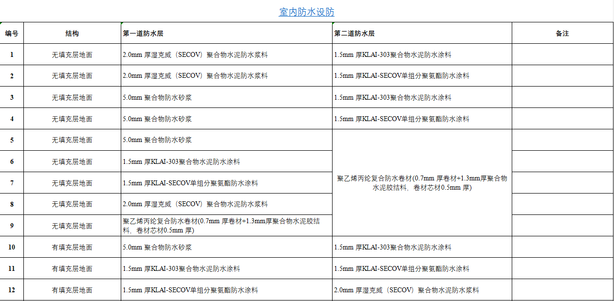 說明:1 防水涂料或防水卷材厚度指單道防水層最小厚度;2 室內(nèi)工程一級設(shè)防,規(guī)定防水設(shè)防道數(shù)不應(yīng)少于2道,其中防水卷材或防水涂料不應(yīng)少于1道,主要是考慮到卷材質(zhì)量的可控以及防水涂料在處理管根、地漏等節(jié)點時的便捷,亦可適應(yīng)基層變形帶來的影響;3 用水空間與非用水空間樓地面交接處應(yīng)有防止水流入非用水房間的措施。淋浴區(qū)墻面防水層翻起高度不應(yīng)小于2000mm,且不低于淋浴噴淋口高度。盥洗池盆等用水處墻面防