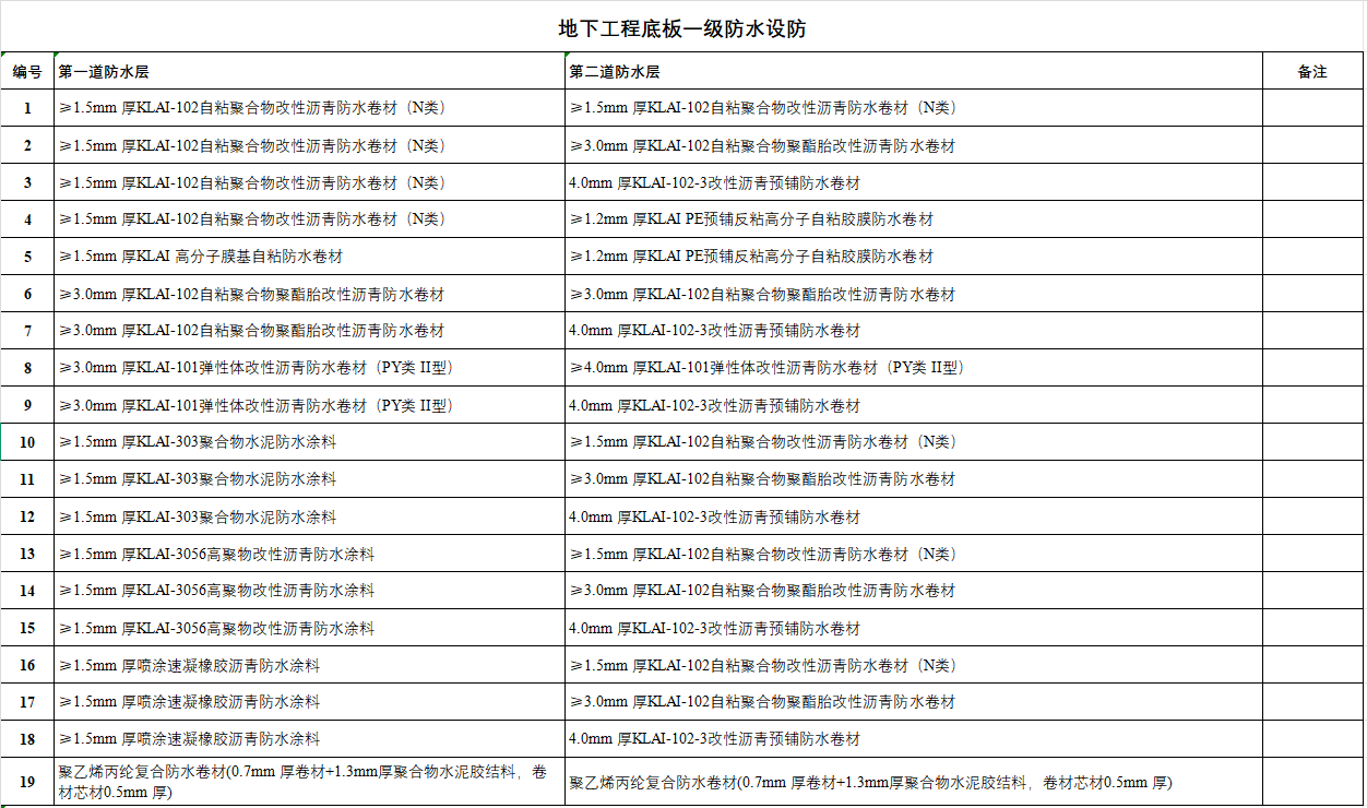 說明:1 防水涂料或防水卷材厚度指單道防水層最小厚度;2 當采用溶劑型聚氨酯防水涂料與瀝青防水卷材相鄰設防時,宜設置 20mm 厚 M15 的水泥砂漿隔離層,其他設計方案同;3 耐根穿刺防水卷材的施工方法應與耐根穿刺檢測報告中注明的施工方法一致;4 粘結材料與防水卷材共同形成復合防水層時,應單獨對粘結材料進行檢測,確保合格;5 當聚乙烯丙綸復合防水卷材、聚乙烯丙綸耐根穿刺復合防水卷材采用水泥基材料