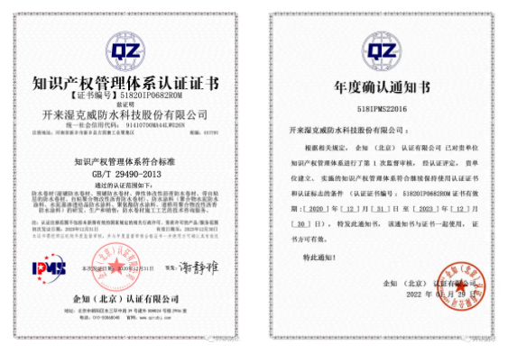 經(jīng)過企知(北京)認(rèn)證公司的審核,于2020年12月31日獲得《知識產(chǎn)權(quán)管理體系認(rèn)證證書》。2022年1月29日,企知(北京)認(rèn)證公司對該體系又做了復(fù)審,并頒發(fā)了《年度確認(rèn)通知書》,該證書的獲得,標(biāo)志著開來濕克威防水科技股份有限公司向知識化、數(shù)字化發(fā)展的方向上又進(jìn)了一步。