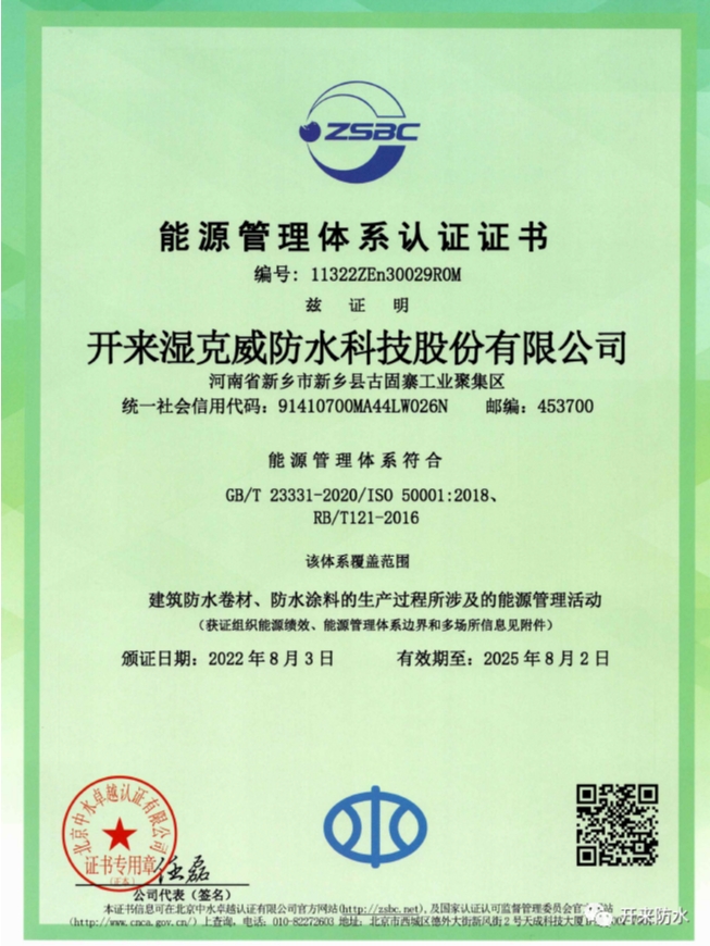 公司通過近一年的積極籌備,在低碳節(jié)能方面,通過多種途徑,降低能耗,發(fā)展綠色產品之路,實現(xiàn)供銷存財?shù)膮f(xié)同發(fā)展。經過北京中水卓越認證有限公司的審核,于2022年8月3日獲得《能源管理體系認證證書》。該證書的獲得,是繼知識產權管理體系、兩化融合管理體系認證之后,又一個標志性的認證,標志著開來濕克威防水科技股份有限公司向綠色低碳發(fā)展的方向上又進了一步。